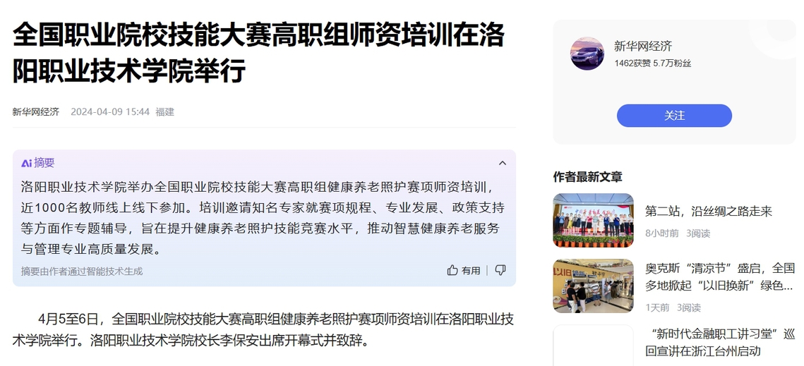 新华网:全国职业院校技能大赛高职组健康养老照护赛项师资培训在洛阳职业技术学院举行