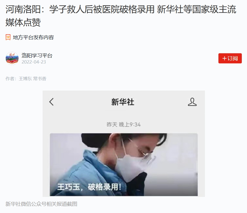 学习强国:河南洛阳:学子救人后被医院破格录用 新华社等国家级主流媒体点赞