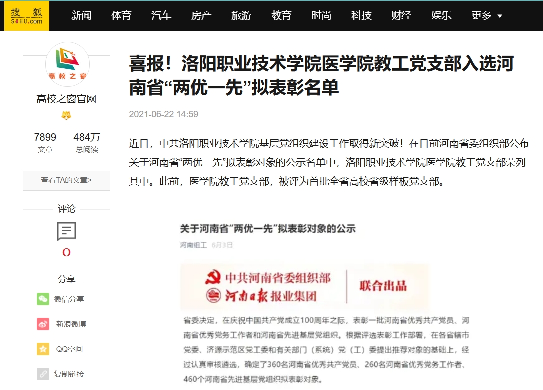 高校之窗:喜报!洛阳职业技术学院医学院教工党支部入选河南省“两优一先”拟表彰名单