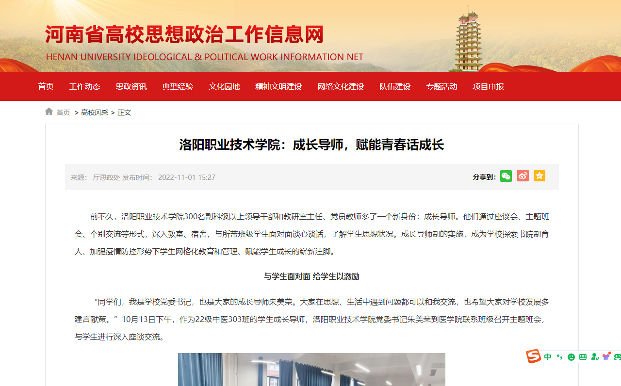 河南省高校思想政治工作信息网:洛阳职业技术学院:成长导师,赋能青春话成长