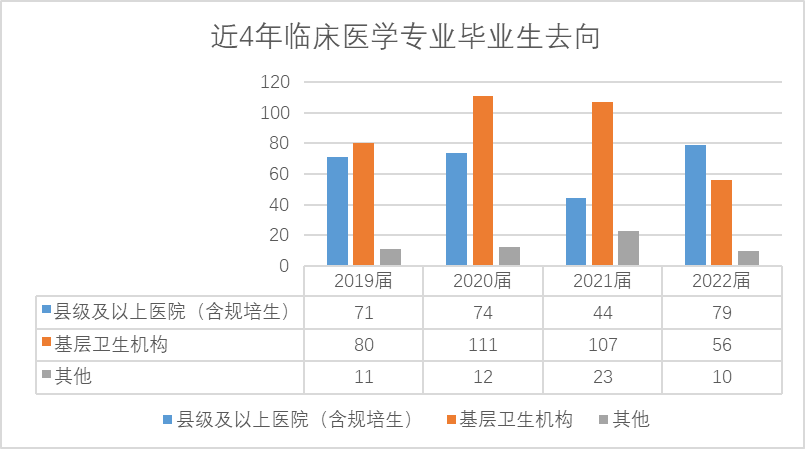 学校从2019年第一届大专临床医学专业毕业生,至今已有四届毕业生,通过对毕业生的去向跟踪调查发现,学生就业的专业对口性较高,50%以上毕业生到基层医疗卫生机构工作,如图6显示,2019届跟踪调查临床医学专业毕业生人数为162人,在县级及以上医院就业的人数为71人,到基层卫生机构的人数为80人,不从事医学的学生有11人;2020届毕业生就业在医院、基层和其他机构的学生人数分别是74、111、12人,2021届毕业生就业在医院、基层和其他机构的学生人数分别是44、107、12人,2022届毕业生就业在医院、基层和其他机构的学生人数分别是79、56和10人。这些数据说明学生对临床医学专业的认可度高,毕业后从事医学的人数占比大,且到基层医疗机构的学生较多。说明大专层次的临床医学毕业生对口就业率高,就业去向主要为基层医疗卫生机构,是基层医疗机构的主力军。