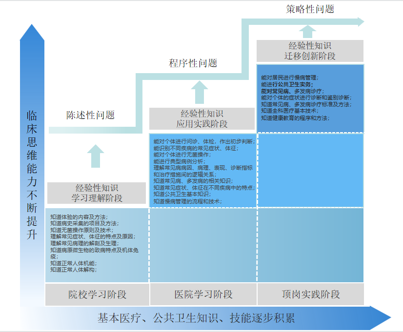 第一,院校学习阶段:即经验性知识学习理解阶段 在院校教育的前 1.5 年时间内,以理论学习为主,重点学习基础医学知识、诊断学基础知识、药理学知识、内科主要疾病、外科学总论、全科医学基础知识、人文知识和健康教育方法等,使学生对医学基础知识和部分临床知识从识记到基本理解,医学基本操作技能在SP上和模型人上完成,并从症状出发,完成对学生临床思维能力的初步培养,学生能够解决陈述性问题。