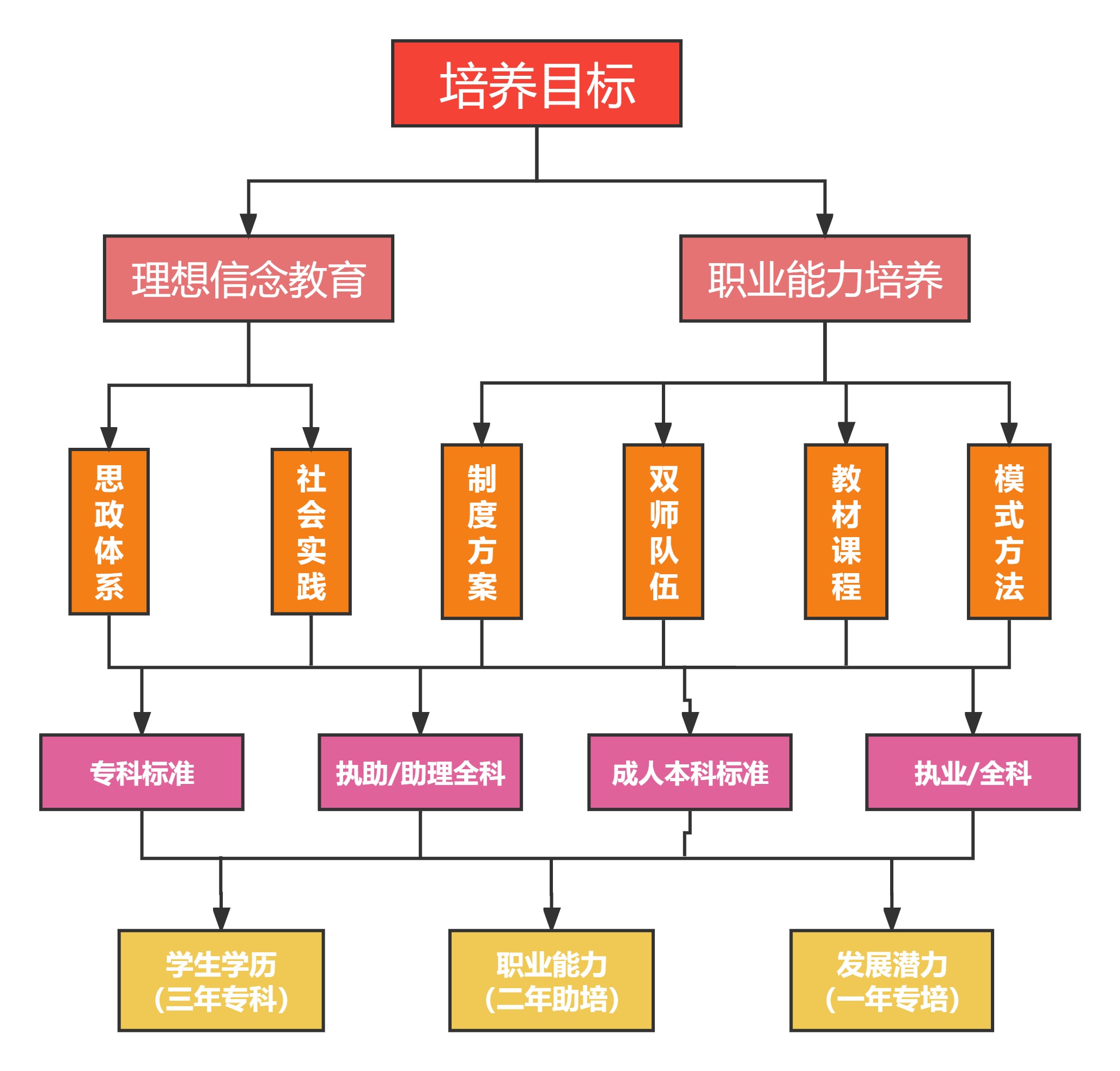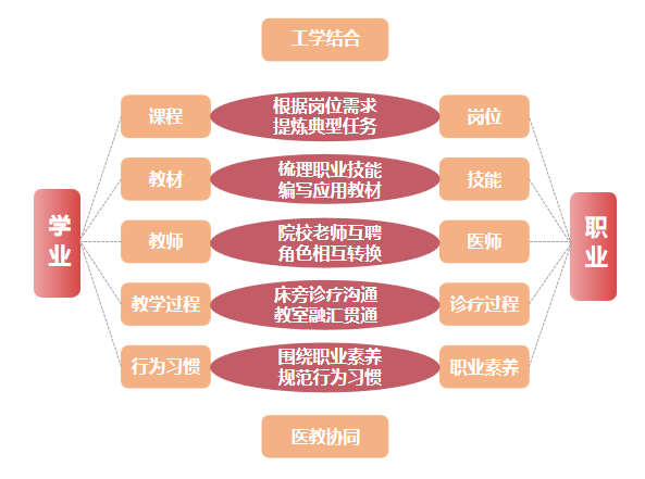 目的:本研究以服务发展为宗旨,以促进就业为导向,以基层医疗卫生岗位胜任力培养为目标,以深化医学教育与行业、产业、企业对接为抓手,以国家大力发展职业教育和健康中国建设为契机,以国家医学教育改革与发展要求及相关标准为准绳,深化医教协同育人机制,构建“3+2”一体化培养体系和3216人才成长路径;坚持立德树人,强化岗位实践;坚持教学标准,突出能力培养;坚持就业导向,开设方向课程,培养医德高尚、医术精湛、一专多能、“下得去、留得住、用得上”的健康“守门人”。