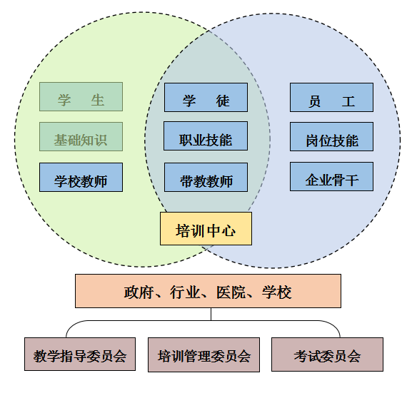 通过建立教学指导委员会、培训管理委员会和考试委员会,实现政府、行业、医院和学校对学生教育的有机融合(图3),实现学生在学校通过学校教师的基础知识的传授,完成学生的角色;在医院带教教师的培养下,完成职业技能的培训,实现学徒目标;再到企业(就业医院)工作锻炼,熟练掌握岗位技能,完成企业员工角色的转变;最终通过政府、学校、助培医院和就业医院的共同培养,顺利实现培养的人才从学生-学徒-员工的角色转变,促进3+2两阶段的有机融合,完成对人才的培养目标。