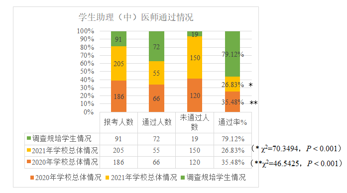 我院每年临床医学专业毕业生大约为300人左右,2019年进入规培医院的学生有73人,2020年进入规培的学生有47人,2021年进入规培的学生有36人,2022年规培学生有105人。2020年学校临床医学学生参加考试学生186人,总助理医师资格证通过人数为66人,通过率为35.48%,2021年学校临床医学学生参加考试学生205人,总助理医师资格证通过人数为55人,通过率为26.83%,经卡方检验有统计学差异(χ2=0.1625,P= 0.049)。同时对毕业学生进行随机问卷星调查,结果显示:共调查306人,临床医学专业209人,参加规培人数为91人(43.54%),助理医师通过人数为72人(79.12%);中医学专业97人,参加规培人数为17人(17.53%),助理医师通过人数为13人(76.47%),而未参加规培的学生通过率为0。临床医学专业参加规培学生的助理医师通过率比2020年总体通过率(χ2=46.5425,P < 0.001)和2021年总体通过率(χ2=70.3494,P < 0.001)显著增高,有统计学意义(图7),这些结果说明参加助理全科医生规范化培训的学生,助理医师资格通过的学生人数比不参加助培的学生通过率高,可见3+2助理全科医师规范化培训的重要性,同时中医学专业参加助力中医生规培的人数比临床医学专业的人数明显少。因此希望国家卫健委能深入调查,根据医学生的招生规模,增大助理全科(中)医生的规培比例,让80%以上的高职高专医学专业毕业生有条件参加规培,从而加快助理全科医师的培养数量,从而缓解基层卫生机构的缺医现象。