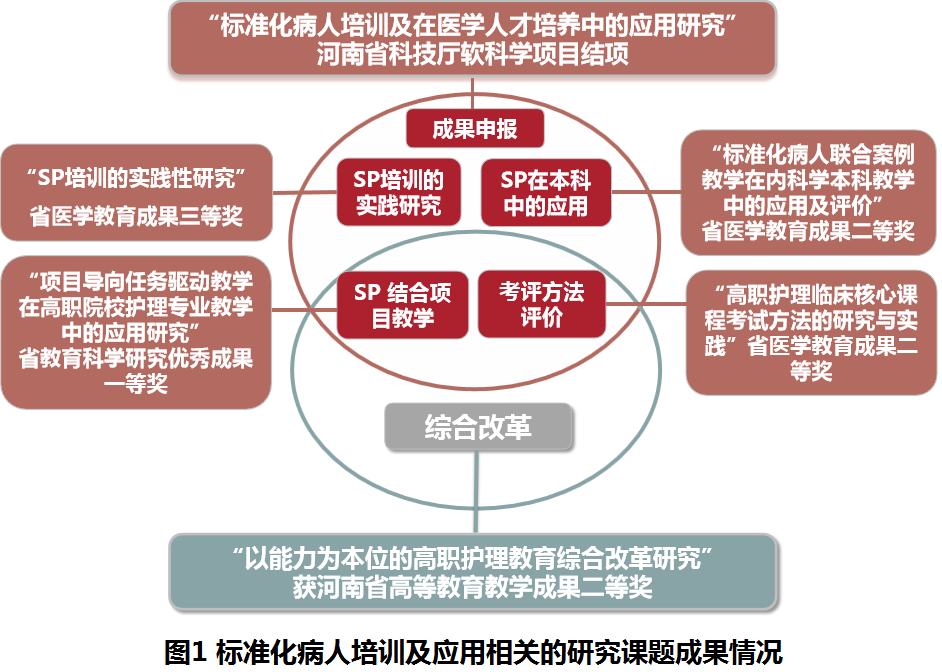 本研究在2015年开始查阅国内外SP培训、教学、技能考核等方面的文献资料,分析目前国内外SP培训、应用现状及存在的问题,明确本研究的内容和目标,并为SP的培训和应用提供依据。在省级课题《以能力为本位的高职护理综合改革》和《项目导向任务驱动教学在高职院校护理专业教学中的应用研究》及厅级课题《高职护理临床核心课程考试方法的研究与实践》中的SP教学考核法和项目教学法的基础上,2017年6月申请校级课题《标准化病人培训及在医学人才培养中的应用研究》,2018年11月在校级课题的基础上申报为河南省科学技术厅的软科学研究计划项目,同时申报2项子课题。经过4学年的教改实践后,取得了丰硕的阶段性成果(成果关系见图1),该校级项目于2019年7月经专家组鉴定结项,被评为校级教育教学成果一等奖,同时相关课题获河南省高等教育教学成果二等奖一项,河南省软科学项目结项一项,厅级教研成果一等奖1项、二等奖2项、三等奖1项。SP培训及SP在不同人群类型、不同学历层次、不同学科、不同教学阶段、不同教学环节的研究研究发表论文10篇,出版论著1部。