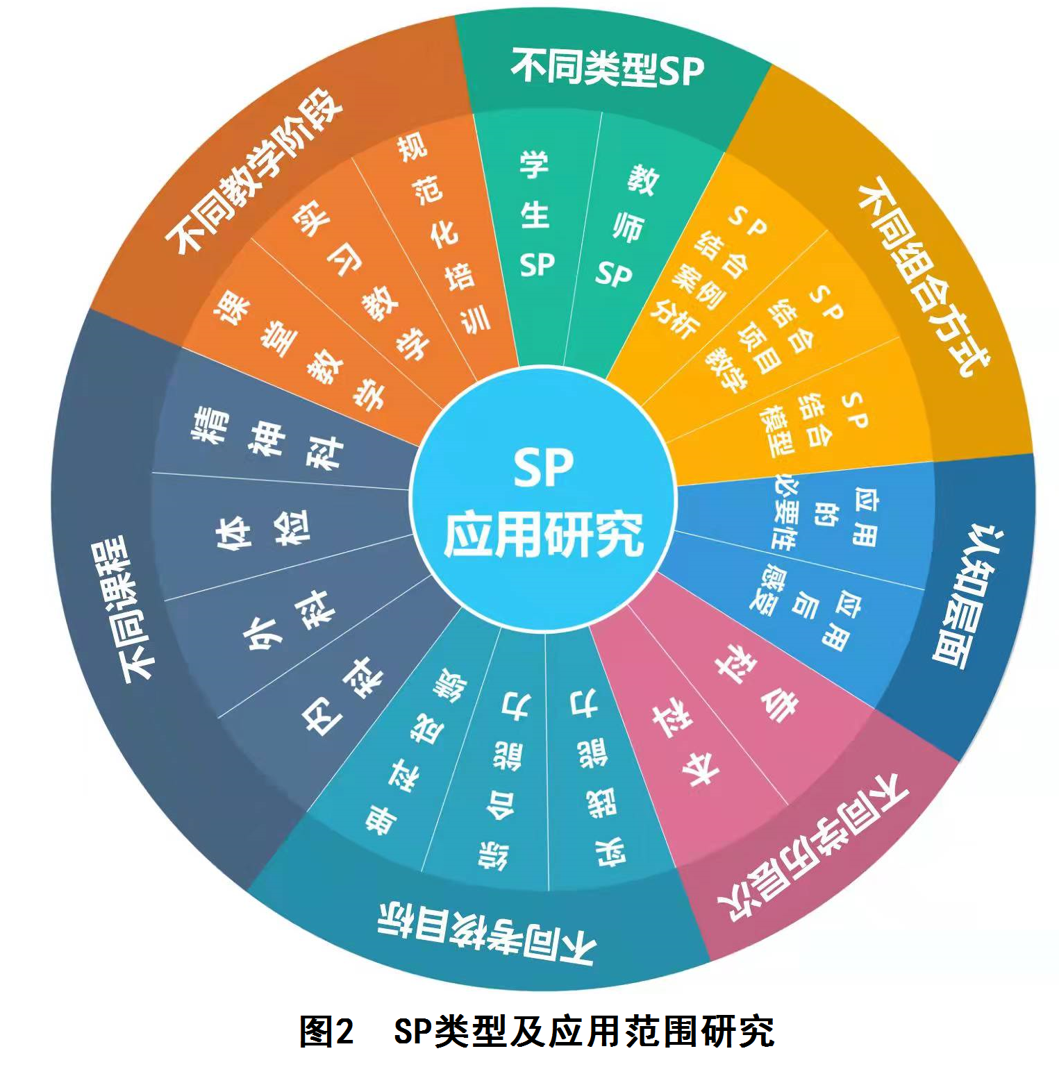 课题组成员及其校内团队通过对不同类型SP的培训及应用、不同教学阶段SP的应用、SP在不同课程教学中的应用、SP在不同考核目标评价中的应用、SP在不同学历层次的教学中应用、SP教学法与其他教学方法联合应用、SP及学生对SP教学的认识及感受等方面开展研究(见图2),研究成果以论文形式发表。多项研究显示:SP教学方法的引入使情景更真实,克服了面对模型问病史,做体检的弊端。SP实践教学缓解了病材不足、病人维权、医学伦理等问题,强化了沟通交流能力、临床思维能力、人文关怀情感的培养,给学习者提供了纠错的机会,减少了医疗差错和医疗纠纷。SP用于校内、实习、规培、执业医师考试,使考试更科学、规范,考察更全面,结果更可靠。